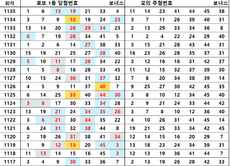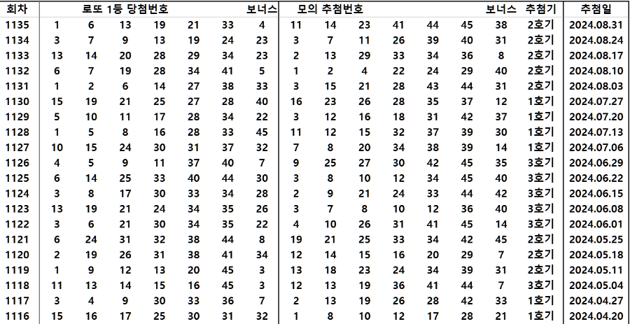 최근 1135회차 당첨번호와 모의 추첨번호까지 정리한 표입니다.