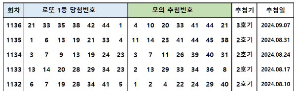 이번주 1137회 로또 당첨 예상번호를 분석할 때, 1136회 1등 번호와 모의번호에서 3개는 선택해 보시는게 좋겠네요.