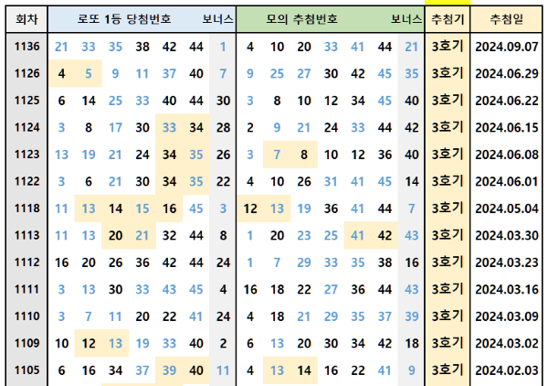 5주간의 추첨기 로또번호를 분석해보면, 각 추첨기마다 조금씩 다른 특성이 있는 것 같아요. 1호기, 2호기, 3호기가 돌아가면서 사용되었는데, 가장 최근인 1136회에는 3호기가 사용되었어요. 3호기에서는 특히 30번대와 40번대의 숫자가 자주 등장하는 경향이 있었죠.